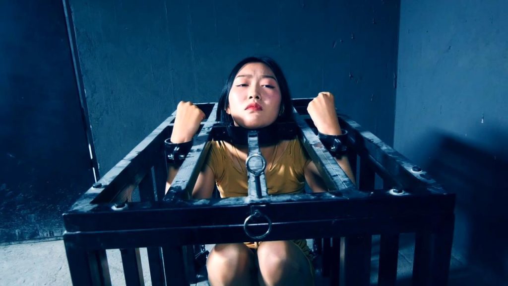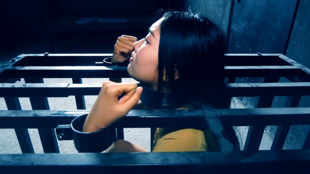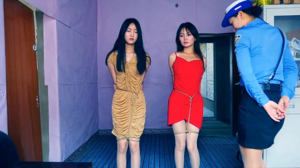 经过授权发布,两个女拒不交代罪行,被罚在笼子里反省,经过一夜折磨终于认罪伏法,然后继续反铐戴臂铐,大腿处也绑上束缚绳约束行动,接着押往囚室。过了一段时间,两个女因为贩卖巨大被宣判死刑,宣判完毕押往戒具室等待执行